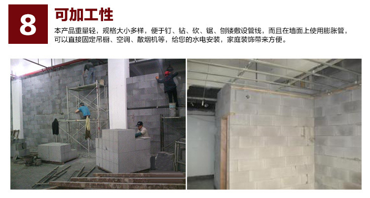 9、 可加工性:本產品重量輕,規格大小多樣,便于釘、鉆、砍、鋸、刨鏤敷設管線,而且在墻面上使用膨脹管,可以直接固定吊櫥、空調、汕煙機等,給您的水電安裝,家庭裝飾帶來方便。